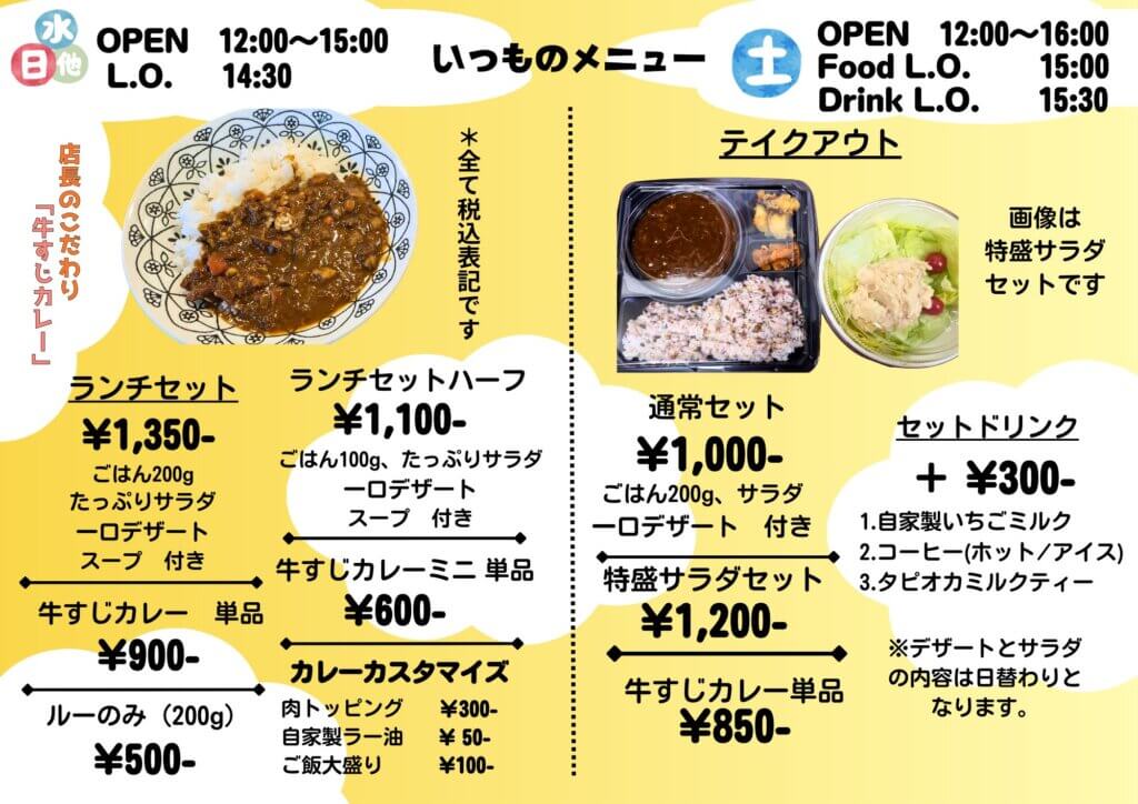 スクロールできます やおやすしょうてん 八百康カフェ 美味しい野菜が自慢です 週2日のみの営業。青果店ならではの新鮮なサラダ。こだわりの牛すじカレーと国産のいちごをじっくりと時間をかけて煮込み、地元の甘みの濃い牛乳と合わせたいちごみるくが自慢のお店です。 中伊豆伊豆市 ¥1,000~¥2,000 ランチ 施設情報写真メニューマップ特典 八百康カフェ やおやすしょうてん エリア 中伊豆伊豆市 住所 伊豆市土肥435-2 アクセス 東海バス 中浜バス停降車 徒歩1分 電話番号 0558-98-0443 営業時間 水曜日、土曜日のみ営業 午後12時~午後6時まで。 伊豆産商品 なし 料理ジャンル お酒ありカフェカフェ・スイーツカレー 予約 予約可 営業日 水土 定休日 月火木金日 平均予算 ¥1,000~¥2,000 支払い方法 PaypayQR決済クレジットカード現金 駐車場 なし 英語メニュー 英語メニュー(写真なし) 個室 なし 座席 カウンターテーブル席座敷 ペット同伴 不可 お子様連れ 可能 キッズサービス 送迎 なし 英語対応 資料等完備(英語の案内記載など) その他サービス 1人からの来店可能無料Wi-Fi完備 メニューに戻る おすすめ3品 土曜限定お刺身定食 ¥1600 牛すじカレーセット ¥1250 ナポリタンセット ¥1100 Filter byAll {中伊豆}|{Central Izu} 中伊豆 体験|Central Izu Experience 中伊豆 土産|Central Izu Souvenir 中伊豆 宿泊|Central Izu Accommodation 中伊豆 温泉|Central Izu Onsen 中伊豆 飲食|Central Izu Cuisine 伊豆の国市|Izunokuni city 伊豆市|Izu city {北伊豆}|{North Izu} 三島市|Mishima city 函南町|Kannami town 北伊豆 体験|North Izu Experience 北伊豆 土産|North Izu Souvenir 北伊豆 宿泊|North Izu Accommodation 北伊豆 温泉|North Izu Onsen 北伊豆 飲食|North Izu Cuisine 沼津市|Numazu 清水町|Shimizu town 長泉町|Nagaizumi town {南伊豆}|{South Izu} 下田市|Shimoda city 南伊豆 体験|South Izu Experience 南伊豆 土産|South Izu Souvenir 南伊豆 宿泊|South Izu Accommodation 南伊豆 温泉|South Izu Onsen 南伊豆 飲食|South Izu Cuisine 南伊豆町|Minamiizu town 河津町|Kawazu town {東伊豆}|{East Izu} 伊東市|Ito city 東伊豆 体験|East Izu Experience 東伊豆 土産|East Izu Souvenir 東伊豆 宿泊|East Izu Accommodation 東伊豆 温泉|East Izu Onsen 東伊豆 飲食|East Izu Cuisine 東伊豆町|Higashiizu town 熱海市|Atami city {西伊豆}|{West Izu} 松崎町|Matsuzaki town 西伊豆 体験|West Izu Experience 西伊豆 土産|West Izu Souvenir 西伊豆 宿泊|West Izu Accommodation 西伊豆 温泉|West Izu Onsen 西伊豆 飲食|West Izu Cuisine 西伊豆町|Nishiizu town 【体験】|【Experience】 【体験】ガイドツアー|【Experience】Guided Tours 【体験】スポーツ関連|【Experience】Sports & Outdoor Activities 【体験】全年齢対象 | 【Experience】All Ages Welcome 【体験】子供参加OK | 【Experience】Kids Welcome 【体験】工芸体験|【Experience】Craft Workshops 【体験】手ぶらで参加OK | 【Experience】Hands-Free Participatio 【体験】文化体験|【Experience】Cultural Experiences 【体験】期間限定 | 【Experience】Seasonal / Limited-Time 【体験】自然体験 | 【Experience】Nature Experiences 【体験】農業体験|【Experience】Farm Experiences 【体験】通年開催 | 【Experience】Available All Year 【体験】雨の日におすすめ | 【Experience】Recommended on Rainy Da 【土産】|【Souvenir】 【土産】アパレル・アクセサリー | 【Souvenir】Apparel/Accessories 【土産】ギフト包装あり | 【Souvenir】Gift wrapping 【土産】伊豆産商品あり | 【Souvenir】Izu speciality 【土産】地酒・飲料 | 【Souvenir】Local sake and beverages 【土産】工芸品 | 【Souvenir】Craft 【土産】書籍・アート関連 | 【Souvenir】Books and art 【土産】花・植物 | 【Souvenir】Flowers/plants 【土産】英語案内あり | 【Souvenir】English menu available 【土産】雑貨・日用品 | 【Souvenir】Daily necessities 【土産】食品 | 【Souvenir】Food 【宿泊】|【Accommodation】 【宿泊】キッズフレンドリー|【Accommodation】Family-friendly キッズフレンドリー 中伊豆|Family-friendly Central Izu キッズフレンドリー 北伊豆|Family-friendly North Izu キッズフレンドリー 南伊豆|Family-friendly South Izu キッズフレンドリー 東伊豆|Family-friendly East Izu キッズフレンドリー 西伊豆|Family-friendly West Izu 【宿泊】キャンプ|【Accommodation】 Camping Sites キャンプ 中伊豆| Camping Sites Central Izu キャンプ 北伊豆| Camping Sites North Izu キャンプ 南伊豆| Camping Sites South Izu キャンプ 東伊豆| Camping Sites East Izu キャンプ 西伊豆| Camping Sites West Izu 【宿泊】グランピング|【Accommodation】 Glamping Sites グランピング 中伊豆|Glamping Sites Central Izu グランピング 北伊豆|Glamping Sites North Izu グランピング 南伊豆|Glamping Sites South Izu グランピング 東伊豆|Glamping Sites East Izu グランピング 西伊豆|Glamping Sites West Izu 【宿泊】ゲストハウス|【Accommodation】Hostel ゲストハウス 中伊豆|Hostel Central Izu ゲストハウス 北伊豆|Hostel North Izu ゲストハウス 南伊豆|Hostel South Izu ゲストハウス 東伊豆|Hostel East Izu ゲストハウス 西伊豆|Hostel West Izu 【宿泊】サウナあり【Accommodation】 with Sauna サウナあり 中伊豆|with Sauna Central Izu サウナあり 北伊豆|with Sauna North Izu サウナあり 南伊豆|with Sauna South Izu サウナあり 東伊豆|with Sauna East Izu サウナあり 西伊豆|with Sauna West Izu 【宿泊】ペット同伴可能|【Accommod